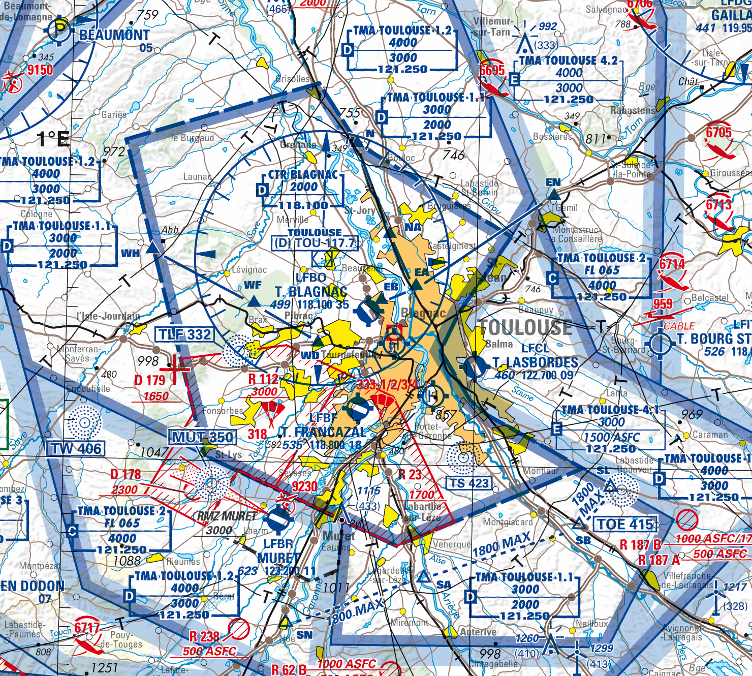 VFR pilots need VFR aeronautical maps for flight planning to identify controlled airspace requiring ATC clearance, during flight for navigation and airspace awareness, and for training purposes. The following excerpt from an VFR aeronautical map shows controlled airspace around Toulouse, France.